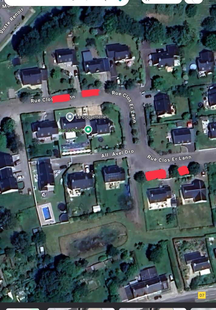 Vous pouvez vous garer sur les places de parking en rouge sur la photo ci-dessous. Merci de ne pas accéder en voiture dans l’Allée Avel Dro.